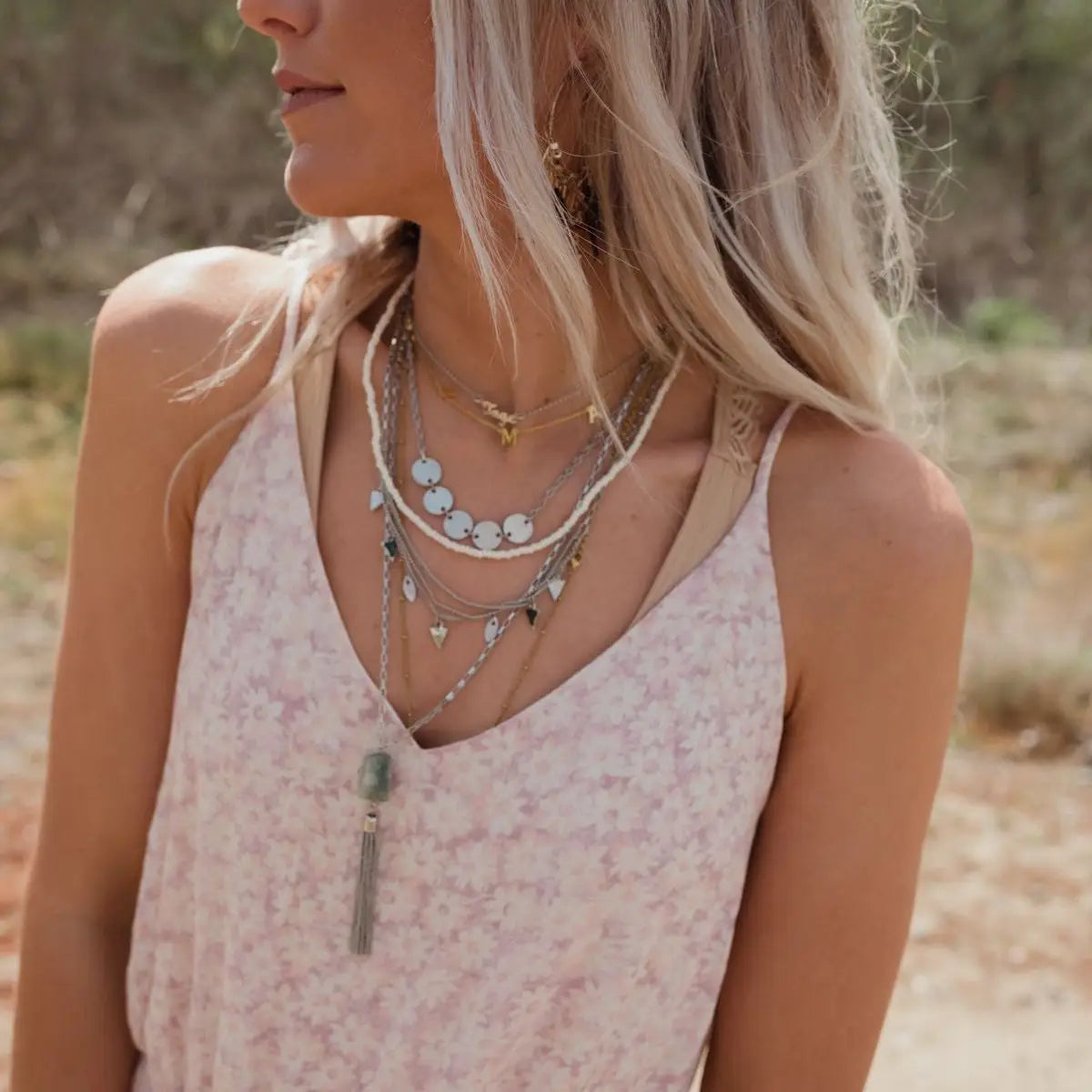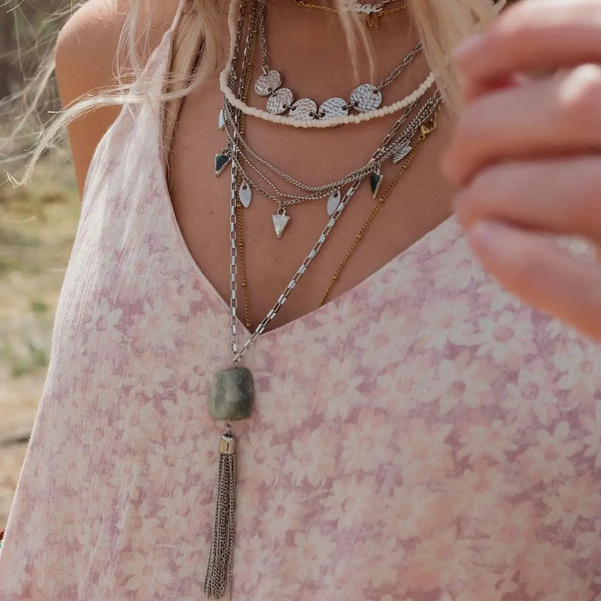 Love the layered boho look, but don't want to deal with the many clasps? This is the necklace for you! Effortlessly get the boho look with this layered necklace including layers of silver chains at different lengths, cute charms, a stone pendant with a chain tassel attached, and a single clasp.